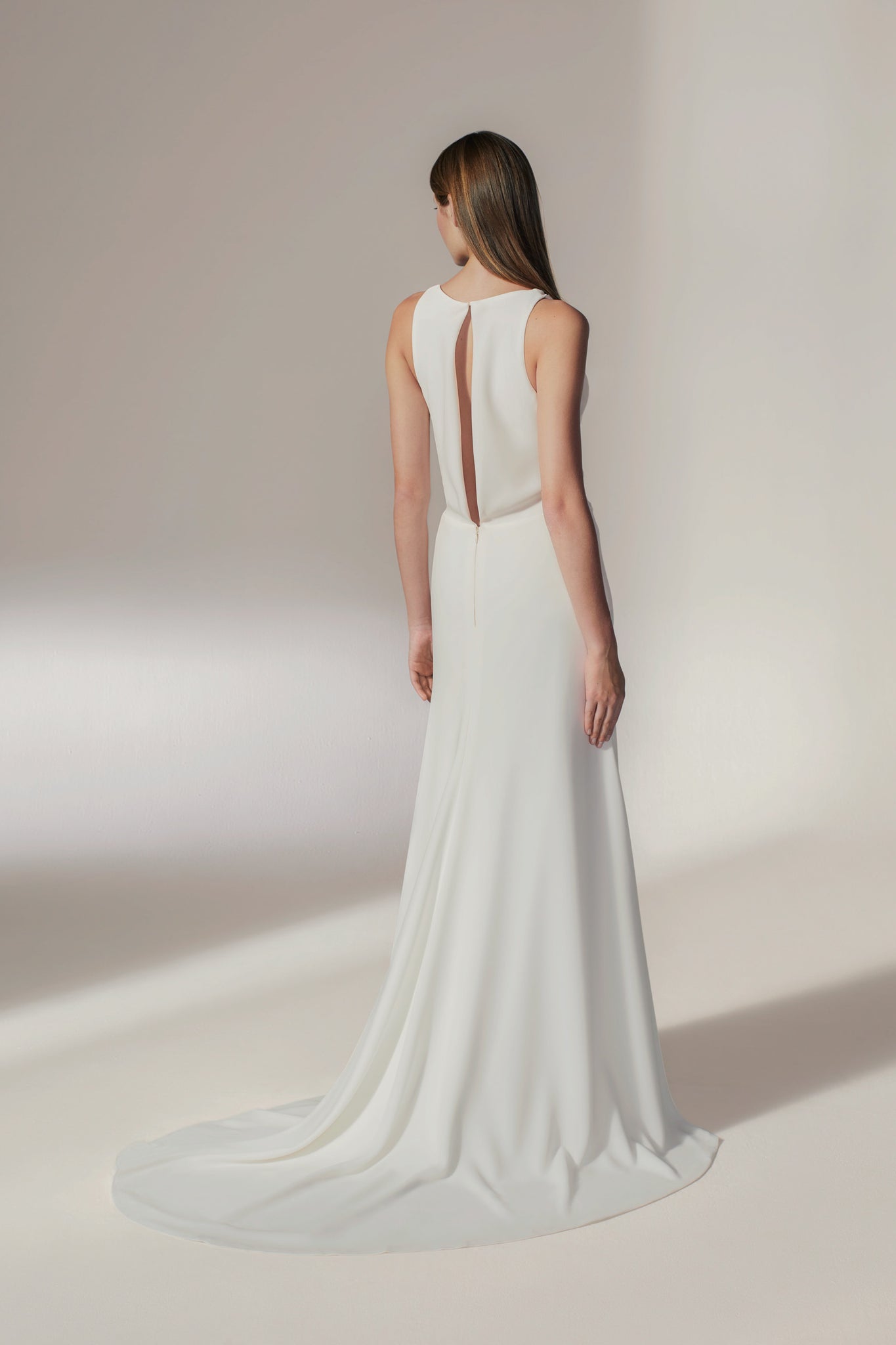 Kreppkleid mit asymmetrischer Drapierung und leichtem Chiffonschal
